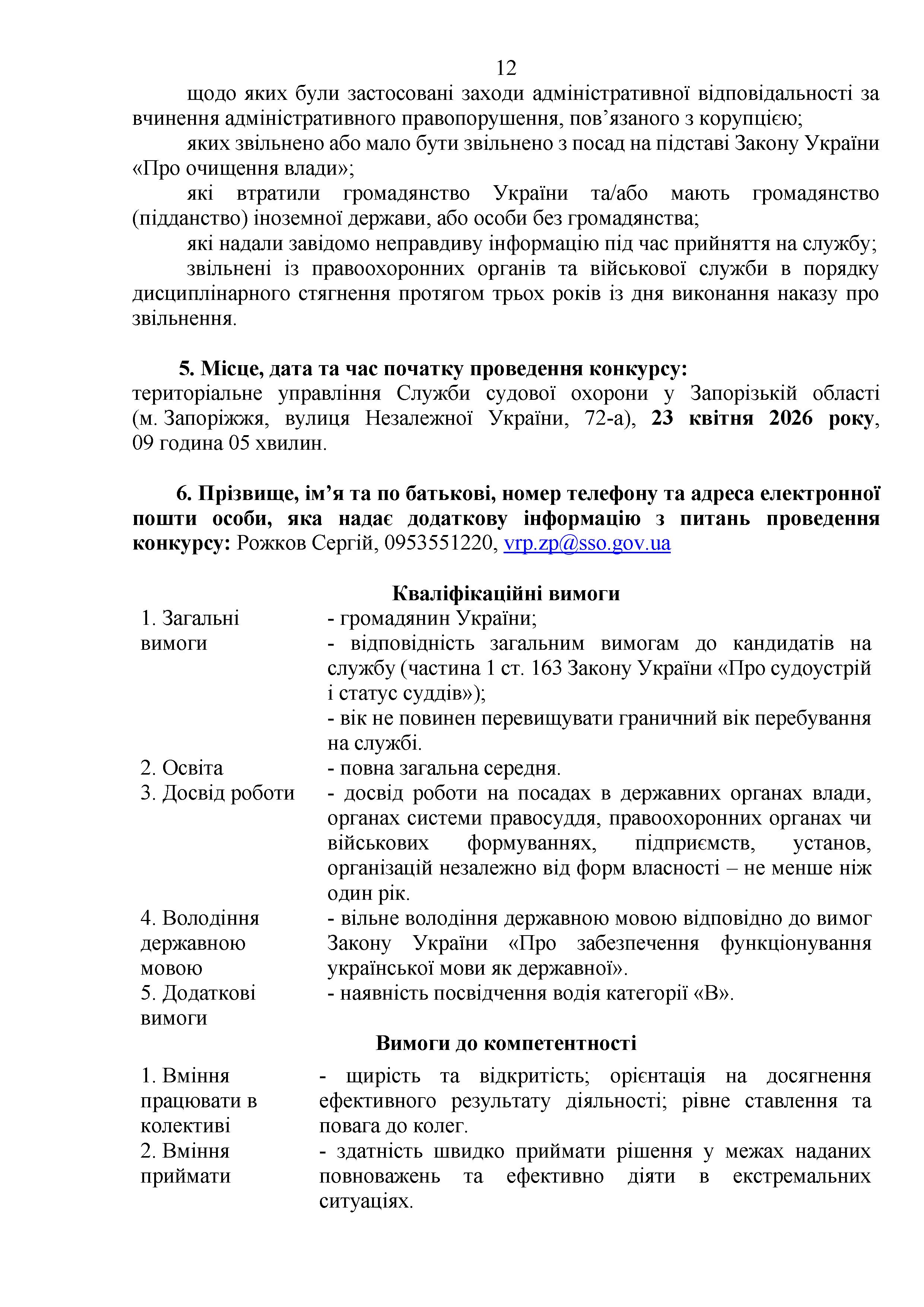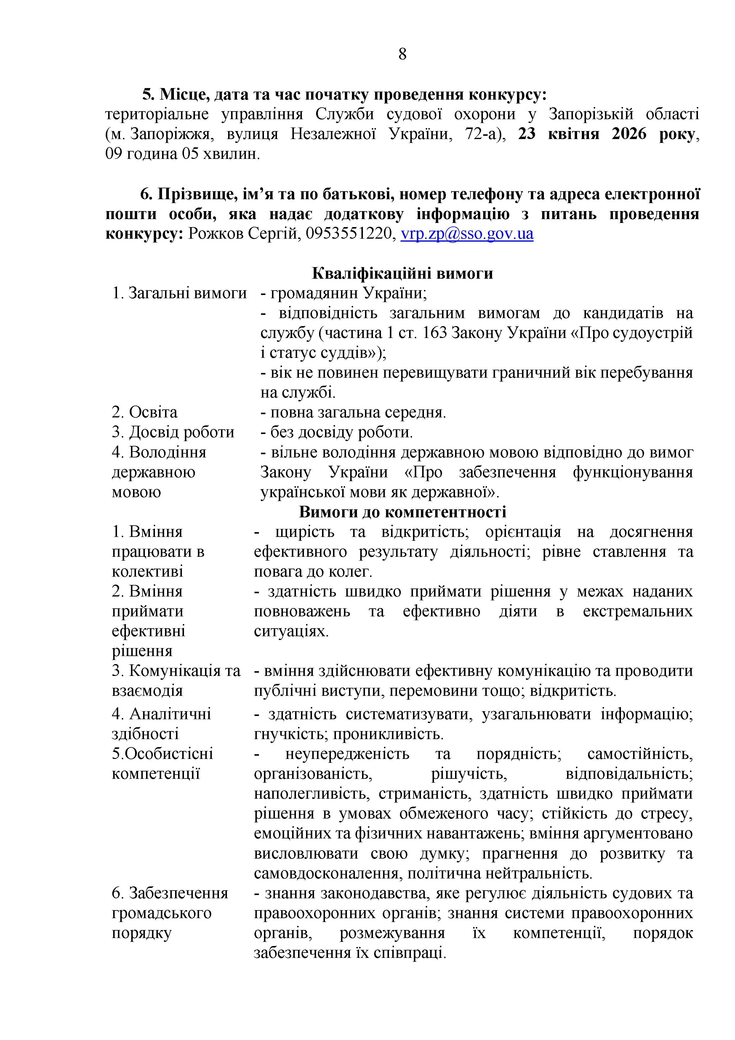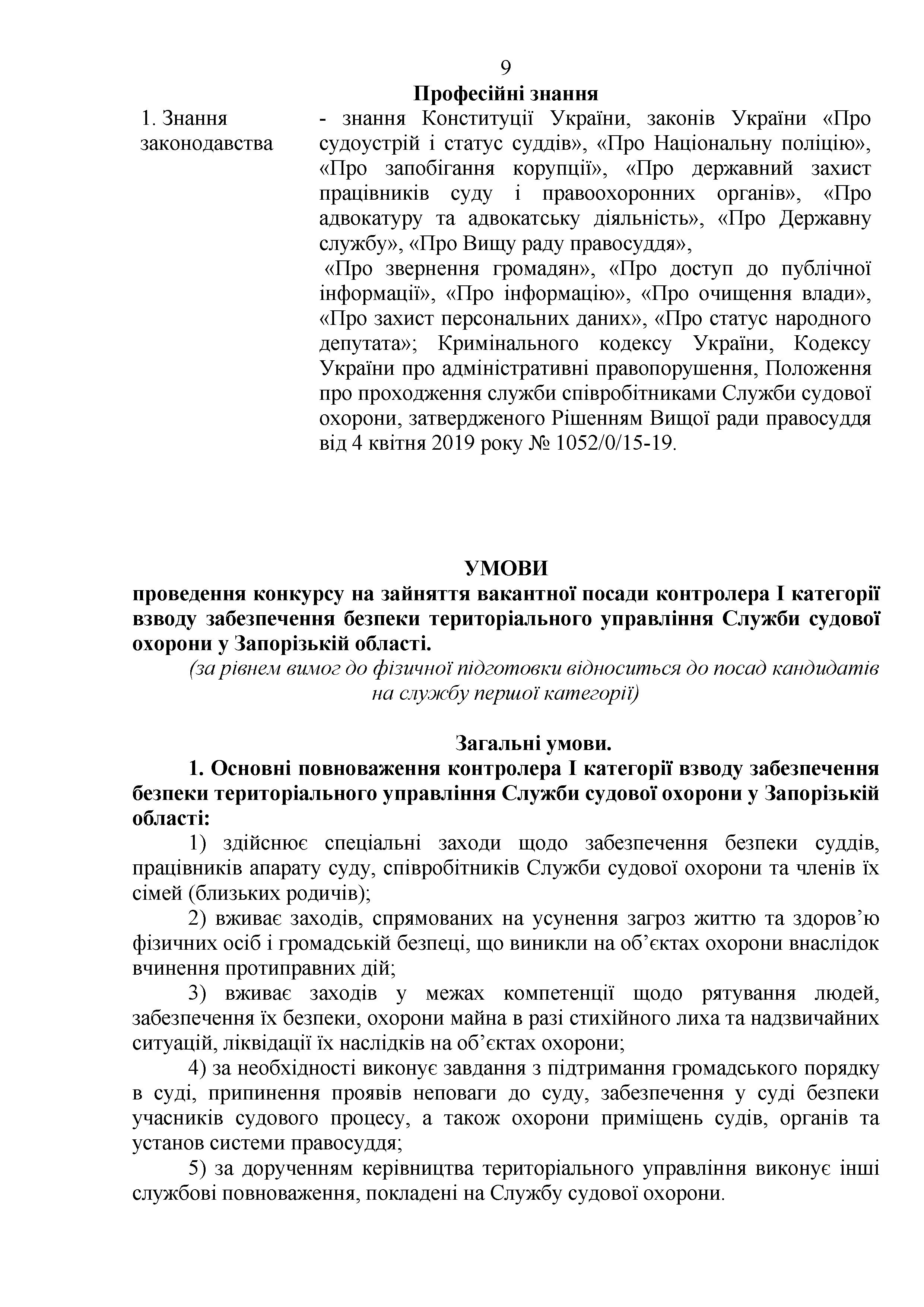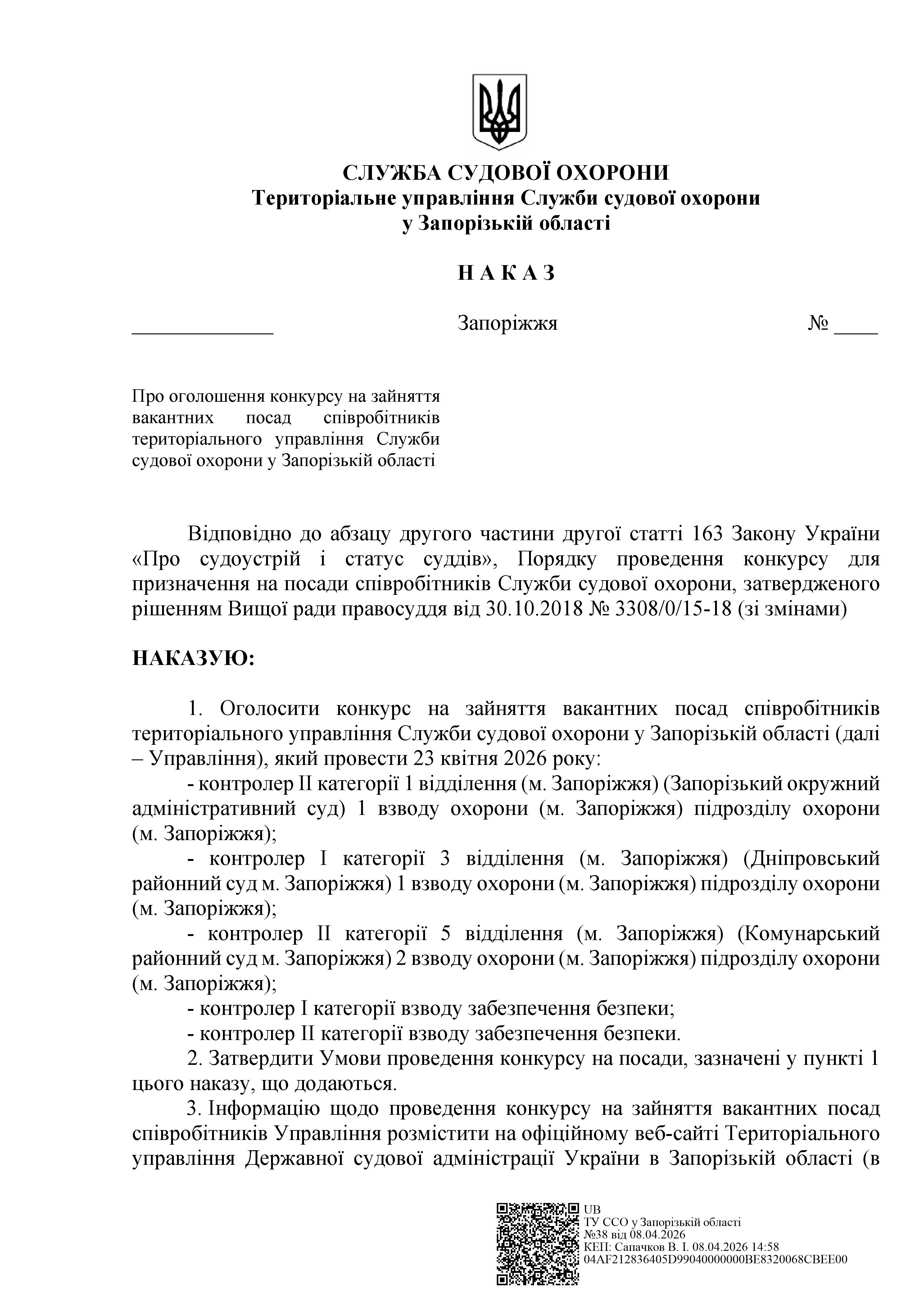 Конкурс на заміщення вакантних посад в територіальному управлінні Служби судової охорони у Запорізькій області